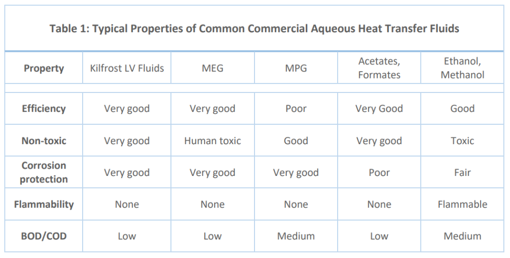 Operational design does bring together all elements of the intended use for the system. However, fluid performance is the workhorse of the system, so allowing for water quality and fluid attributes is key to ensuring efficient and risk-free operation. Manufacturers of commercial formulations are able to advise on water quality that will be preferable to use with their fluids. More generally, the following table summarises the common properties of common aqueous based heat transfer fluids.